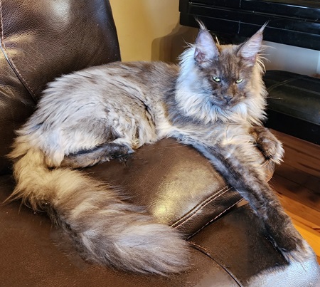 Za'Merlin combines a dramatic, “wild” Maine Coon look with a true family-cat temperament. His offspring tend to have big, expressive eyes and wonderful ear set with strong lynx tips.