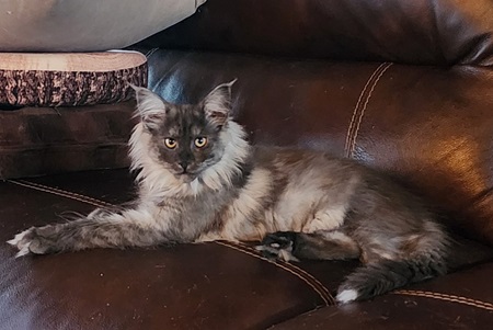 "Lightning" is a treasure to our cattery. Her mother is Pepperazzi a 28 pound female that was the matriarch to all our females. Lightning has the same motherly instincts already. She hangs with all the moms and their kittens and plays with them and cleans them. She is very mild mannered and super sweet. She loves to find a lap with a blanket and snooze and snooze. She is all play or find a lap. Her looks: well they are HOT! A Lightning bolt is said to be 5x the suns temp. We think she is "smokin hot".