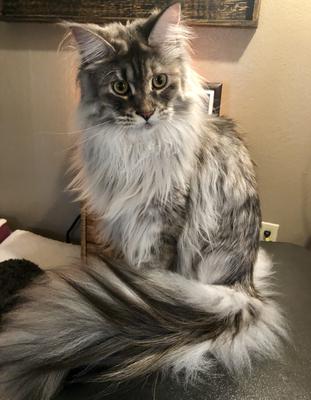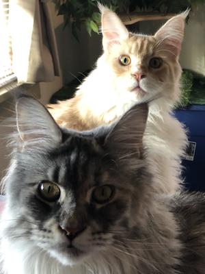 These are the two siblings we are lucky parents of. These are their one year old pics. Yeti is the cream colored male and Miesha is the grey female. Yeti is SO LOVABLE and a mamas boy. Love my coons!